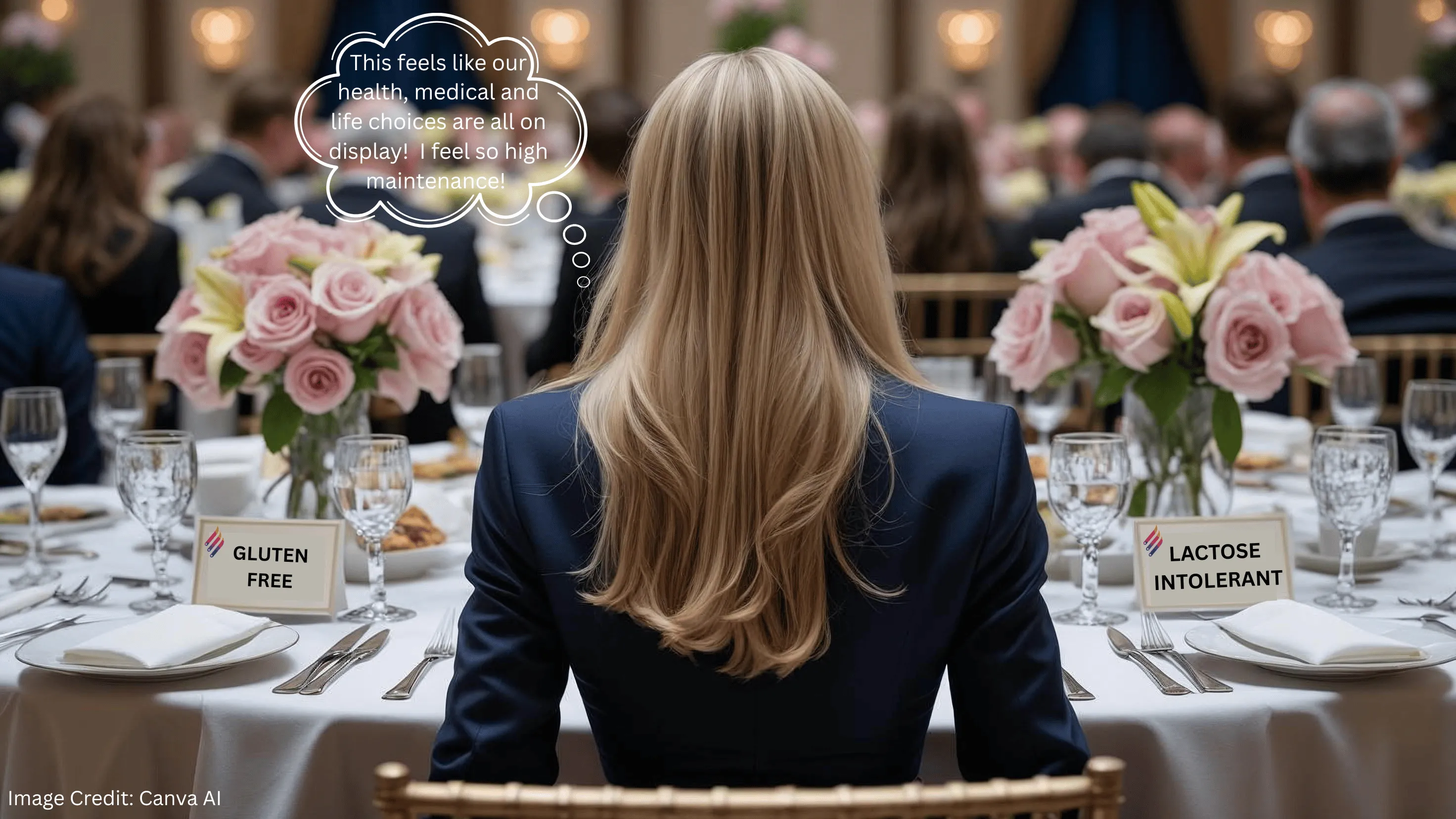 Your fellow guest takes a seat, looks at the place cards and starts to ask you questions about your dietary card and wait – what ???!!!!